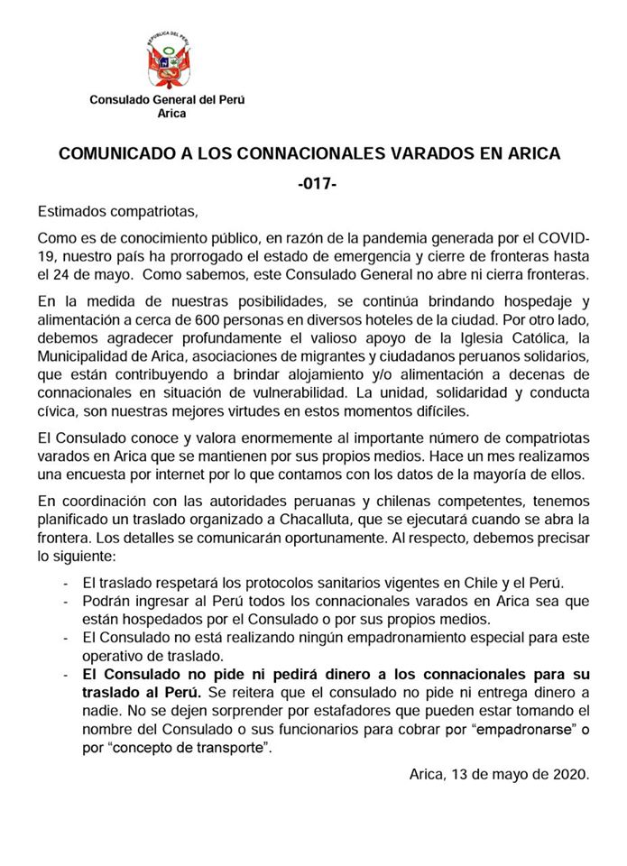 En un comunicado oficial del Consulado General de Perú en Arica, se dio a conocer que sus compatriotas podrán regresar a su país, cuando abran la frontera peruana. En primera instancia, esto sería el 24 de mayo, siempre y cuando, el Gobierno Peruano no prorrogue la medida.