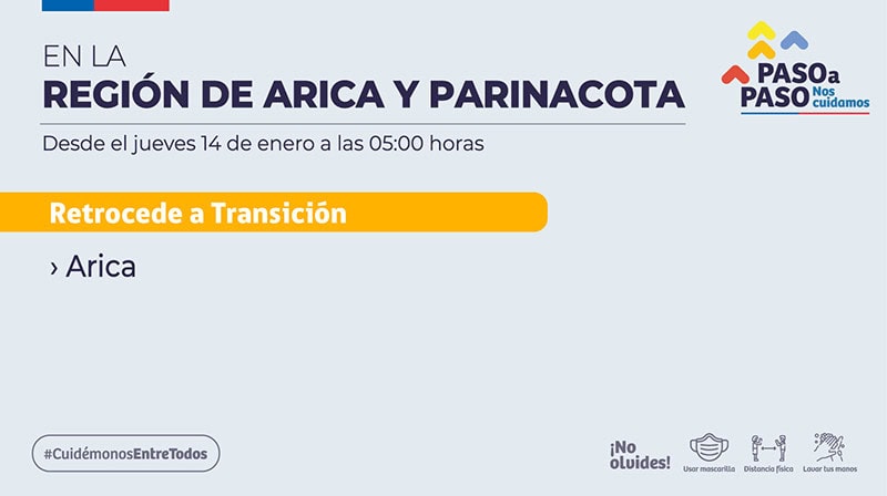 La subsecretaria de Prevención del Delito, Katherine Martorell, anunció que a partir del jueves 14 de enero a las 05:00 horas, la ciudad de Arica retrocede a Transición.