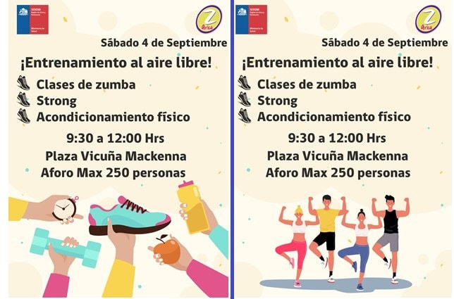 Este sábado entre las 9.30 y las 12.30 horas habrá una entretenida jornada de entrenamiento al aire libre con clases de Zumba, Strong (entrenamiento grupal que combina ejercicios cardiovasculares con movimientos de peso corporal), acondicionamiento físico, y complementado con puntos de vacunación extraordinarios para influenza, segunda dosis, rezagados y reforzamiento anti Covid, además habrá testeo VIH y en general stands para la vida saludable.