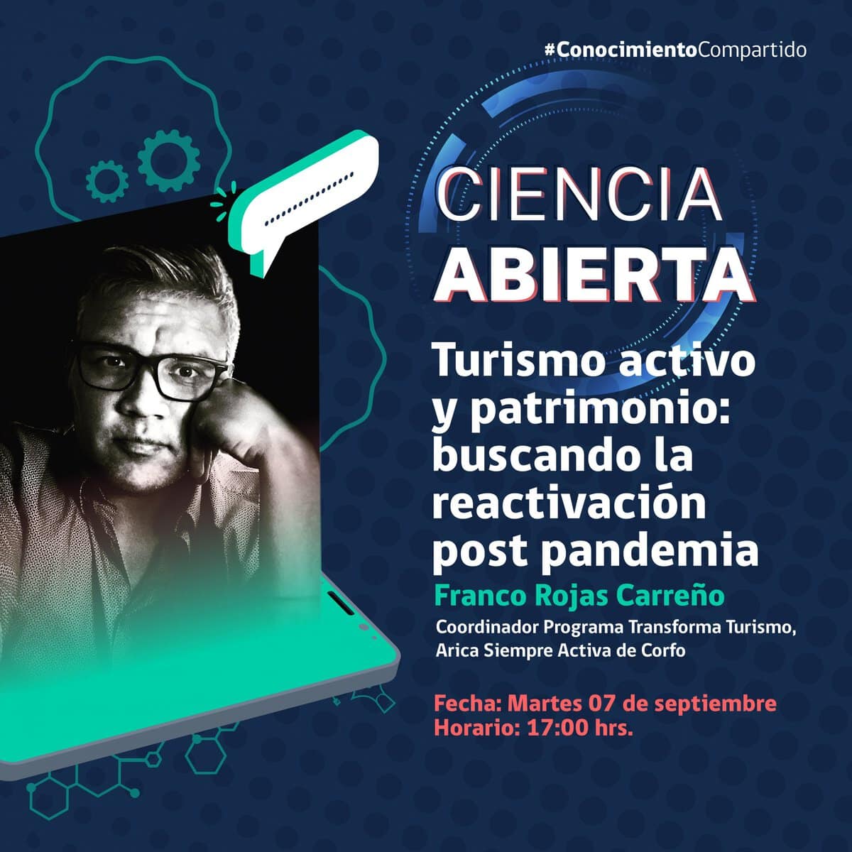 La actividad se transmitirá de manera digital a través del siguiente enlace: http://exploraxv.uta.cl/ciencia-abierta/2021/09/01/turismo-activo-y-patrimonio-buscando-la-reactivacion-post-pandemia/?fbclid=IwAR143qCFYsoi0N08YZTJQKqR4k05_Psg3mQMBkL0NSjw-Z0AgwcvSw32UL0