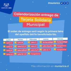 Cabe señalar que, la entrega se hace por orden alfabético, por lo que se insta a los beneficiarios revisar las listas publicadas en la página web de la Municipalidad, www.muniarica.cl, y ver qué día y lugar le corresponde.