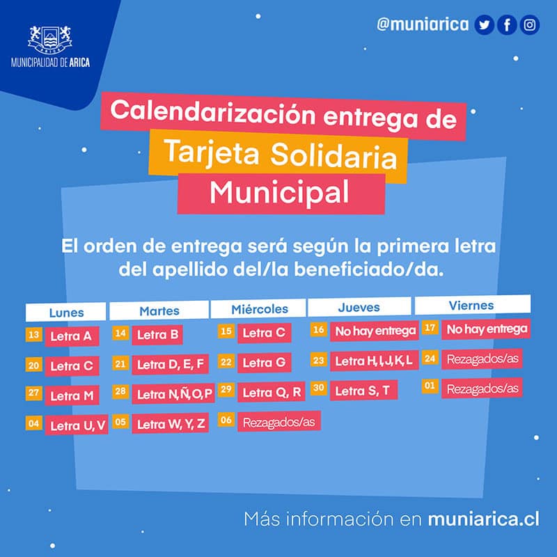 La Municipalidad de Arica, reitera el llamado a las personas que resultaron beneficiadas con la Tarjeta Solidaria a concurrir a los lugares destinados para la entrega, y cumplir con el trámite y a su vez reactivar la economía familiar y comercial de la ciudad.