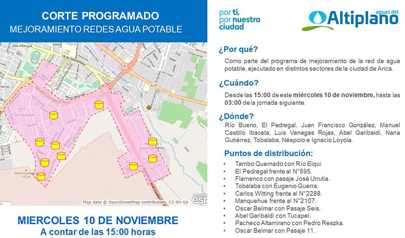 Para efectuar diversos trabajos de mejoramiento en la aducción Pago de Gómez – Saucache; Aguas del Altiplano realizará un corte programado este miércoles 10 de noviembre en el sector oriente de la ciudad de Arica.