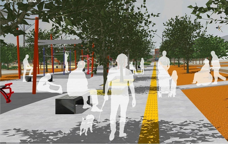 La innovadora área verde será equipada con una ciclovía recreativa y educativa, para que los niños y niñas aprendan a ocupar sus bicicletas de forma lúdica y segura. También contará con juegos infantiles inclusivos, sombreaderos, anfiteatro, máquinas de ejercicio y suelo blando de caucho.
