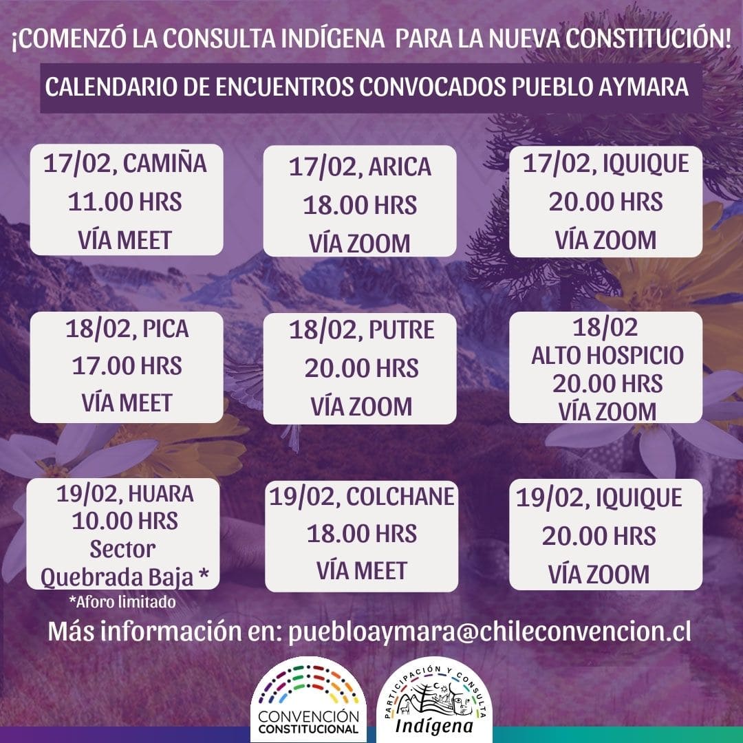 El pueblo aymara tiene la posibilidad de decidir colectivamente la forma de garantizar sus derechos en la nueva constitución, pues junto a los otros nueve pueblos originarios, podrán participar en las jornadas de difusión de la Consulta Indígena. Desde el 14 de febrero y hasta el 4 de marzo se realiza el proceso de deliberación de la Consulta Indígena y durante esta semana se realizan las jornadas de difusión para entender y participar del proceso.