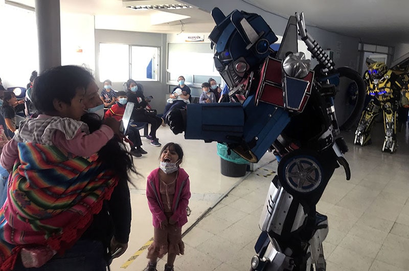 Los disfraces que usaron los voluntarios fueron hechos a mano con materiales reciclados y las niñas y niños del Hospital de Arica disfrutaron sacándose fotos, grabando saludos para sus familiares y riendo de buena gana con los bailes y las rutinas de los personajes.
