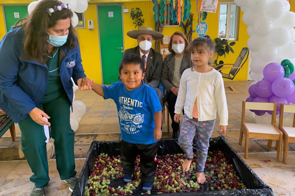Toda una experiencia fue para las niñas y niños que asisten al jardín infantil de la JUNJI “Avioncito” recrear una de las principales actividades costumbristas de la comuna de Camarones: el pisa-pisa de la uva.