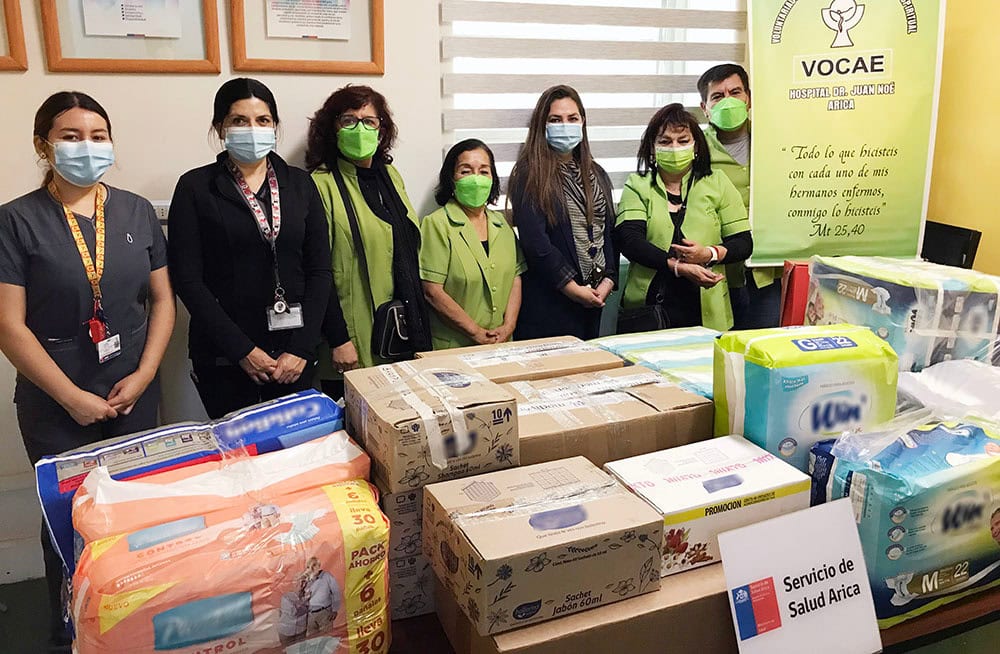 La directora subrogante del Servicio de Salud Arica (SSA), ingeniero Patricia Sanhueza, recibió, el viernes 10, un donativo de más de dos mil doscientas unidades de pañales, sabanillas y útiles de aseo para las personas usuarias del Hospital Regional de Arica Dr. Juan Noé, con motivo del 15 aniversario del Voluntario católico de acompañamiento espiritual (VOCAE), liderado por Irma “Mimí” Navarrete.
