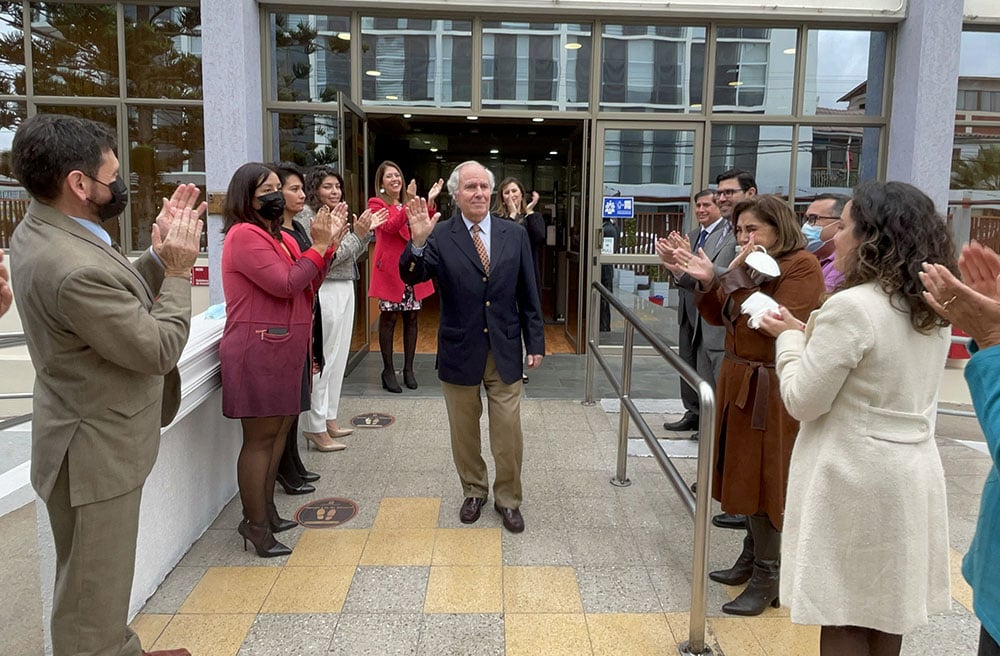 Antes de abandonar el tribunal, Marcelo Urzúa fue despedido en un pasacalle conformado por ministros y funcionarios, quienes aplaudieron al ministro, saludo al que se sumaron jueces y funcionarios de los tribunales que se ubican a un costado y al frente de la Corte de Apelaciones de Arica.