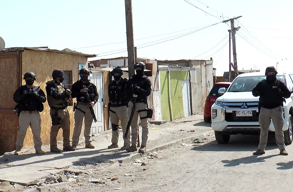 Se procedió a registrar 23 domicilios del sector Cerro Chuño de la ciudad de Arica, lugar de operaciones de la organización criminal denominada “Los Gallegos”, ligada directamente con el grupo criminal “Tren de Aragua”, ambas de origen venezolano.