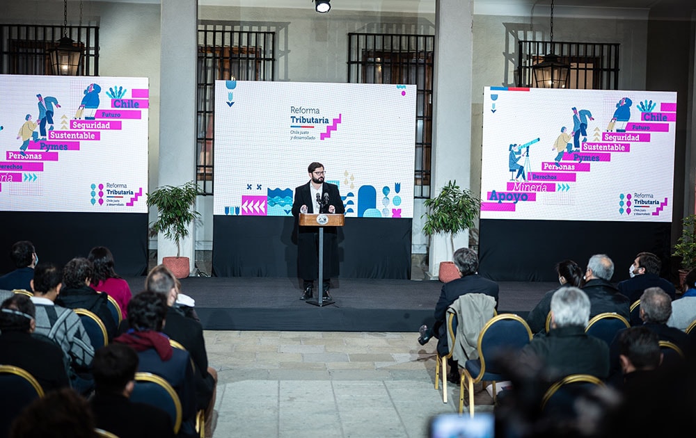 El Presidente Gabriel Boric junto al ministro de Hacienda Mario Marcel anunciaron esta mañana en el Palacio de La Moneda el contenido de la reforma tributaria, la primera de las reformas estructurales de su administración con la que espera recaudar del orden de 4,1 puntos del PIB cuando esté completamente en régimen.