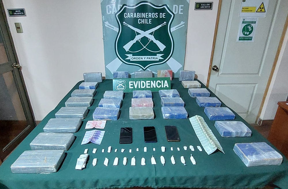 Desde ese momento, el fiscal de turno, instruyó que el OS7 de Carabineros quedara a cargo de la investigación, logrando al cabo de intensas diligencias, detener al receptor de la mercancía y posteriormente allanar su domicilio, desde donde se decomisaron 28 kilos 415 gramos de Clorhidrato de Cocaína, 54 gramos 900 milígramos de Pasta Base de Cocaína, 11 gramos 810 milígramos de Marihuana, 2 vehículos, 3 teléfonos celulares y $124.000 pesos en dinero efectivo.