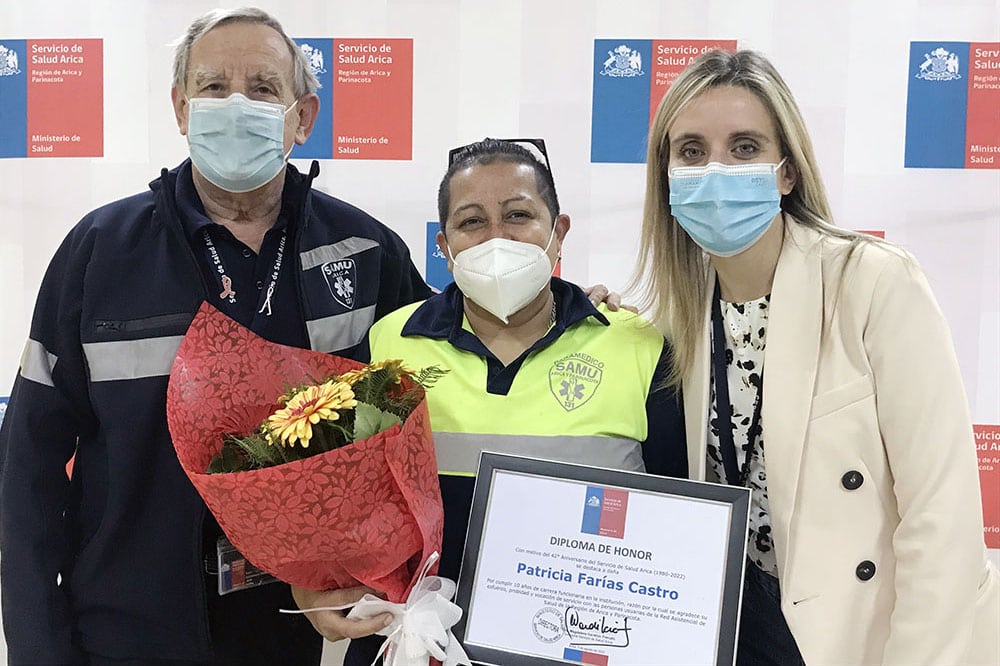 La directora del Servicio de Salud Arica, doctora Magdalena Gardilcic, junto a los subdirectores de su institución, entregó distinciones a las y los funcionarios que cumplieron 10, 20 y 30 años de carrera con motivo del cuadragésimo segundo aniversario, desde que iniciara la coordinación de la red asistencial el año 1980.