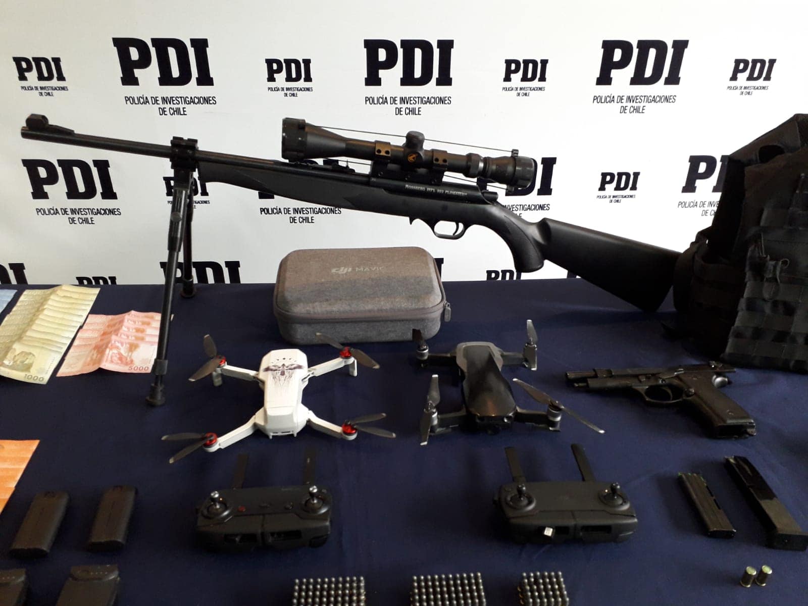 Esta diligencia llevada a cabo por detectives de esta unidad especializada, permitió detener a cuatro imputados, mayores de edad y de nacionalidad chilena, e incautar 56 kilos y 810 gramos de clorhidrato de cocaína. Además, de 04 vehículos, 01 chaleco antibalas, 01 rifle (calibre 22), 120 cartuchos .22, 01 pistola a fogueo, 01 grillete de seguridad, 01 notebook y 02 drones, junto con teléfonos celulares y $ 507.000 en dinero nacional y en efectivo. Mientras que uno de los detenidos sería ex funcionario de carabineros, el cual lideraba esta banda delictual y mantenía comunicación constante con uno de los cabecillas de Los Gallegos, coordinando la entrega de las especies.