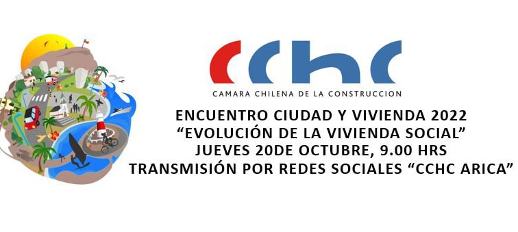 Un tema tremendamente atractivo será el que tendrá el XVII Encuentro Ciudad y Vivienda, ya que este 2022 el título será: “Evolución de la vivienda social”, actividad organizada por la Cámara Chilena de la Construcción Arica (CCHC), la que se desarrollará el jueves 20 de octubre, a las 9.00hrs, transmitido por redes sociales del gremio (Facebook y youtube).