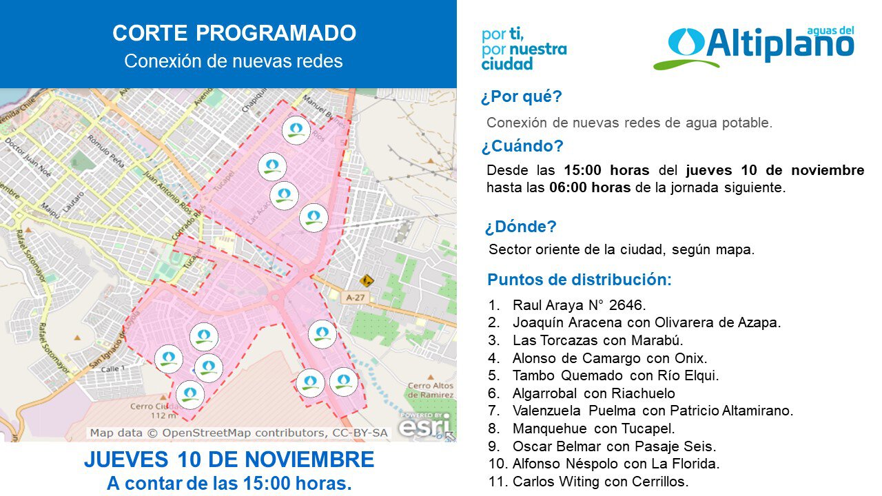 Según avanzan las obras del proyecto “Mejoramiento Pasada Urbana Ruta 5-A27”, en acceso al valle de Azapa y para posibilitar la conexión de las nuevas redes de agua potable instaladas en el sector, Aguas del Altiplano llevará a cabo un corte programado de suministro de agua potable en el sector oriente de la ciudad.