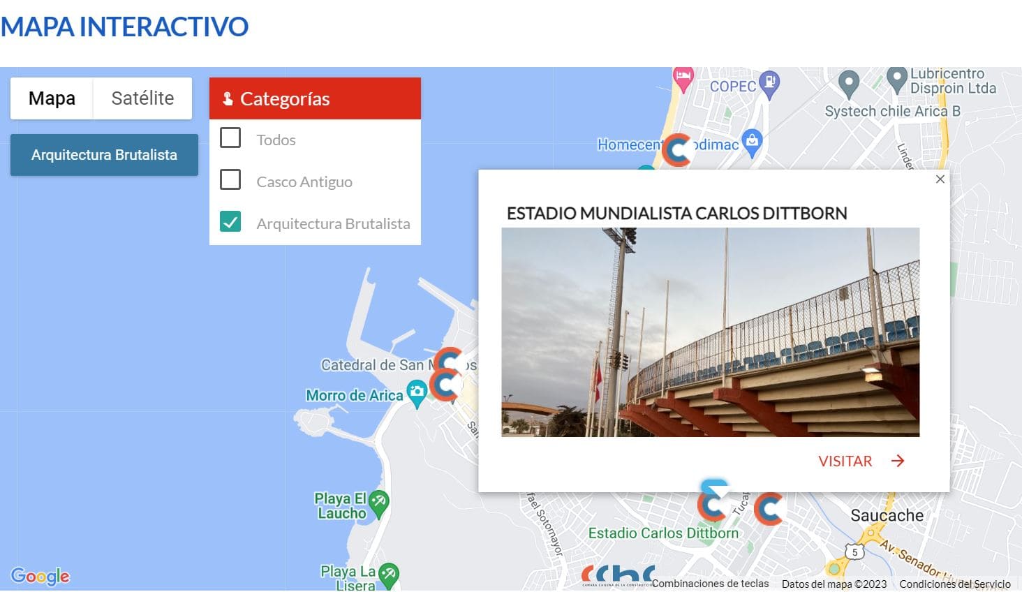 Es por lo anterior, es que la Cámara Chilena de la Construcción (CChC) de esta región finalizó la segunda parte del Georreferencial, que en esta oportunidad destaca y resalta la infraestructura brutalista en los años 50, 60 y 70 (la primera versión trató sobre las obras del casco antiguo), la que se puede encontrar en el sitio https://cchc.cl/gremial/camaras-regionales/arica/mapa-interactivo y disponible para toda la comunidad.