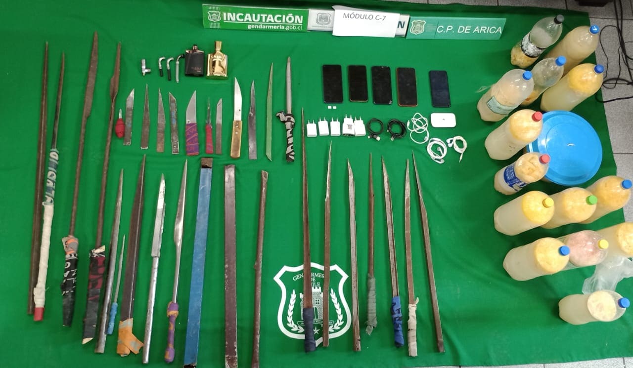 Respecto a lo incautado, en el CP Arica, en el caso del módulo C-6 se encontraron: 3 teléfonos celulares, 21 armas blancas, 11 litros de licor artesanal, 9 elementos contundentes, 2 cables USB, 1 cargador de teléfono celular, 1 manos libres.