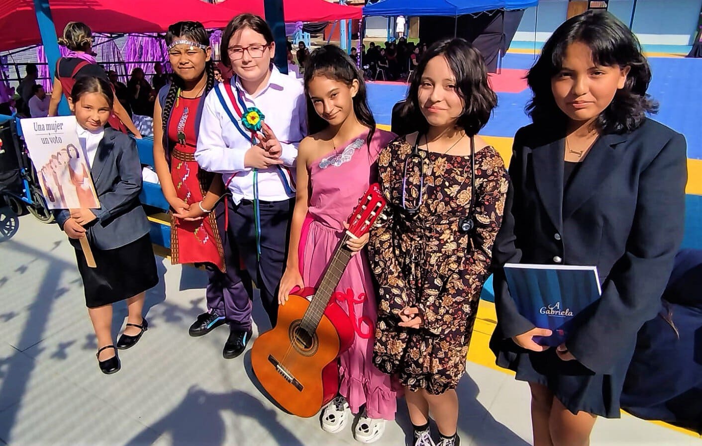Así, por el patio principal de la escuela, se presentaron Elena Caffarenna (Maite Lazo), Guacolda (Jader Saucedo), Michelle Bachelet (Sofía Ibarra), Violeta Parra (Angélica Linares), Eloísa Díaz (Angela McPherson) y Gabriela Mistral (Gabriela Quispe).