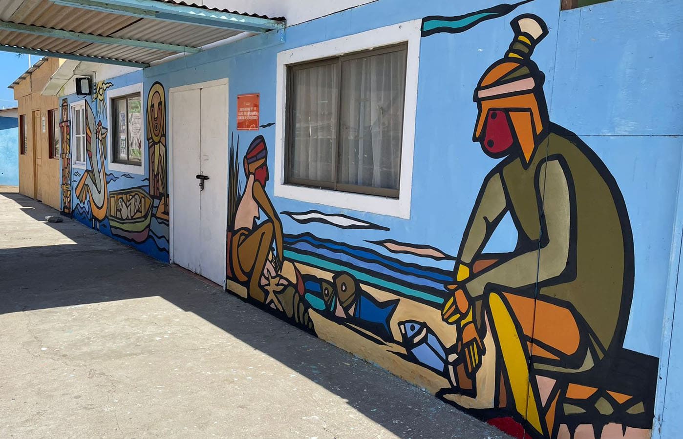 Por su parte, Mono González explicó que los murales reflejan “el entorno, que tiene que ver con el agua, con los azules (si ven los colores), con los amarillos y los ocres de lo que vivimos hoy con el desierto y lo inhóspito. Pero me imagino que hubo más vegetación, o sea como sobrevivían a su relación con el mar”.