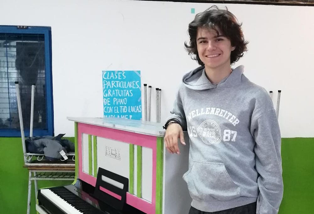 Lucas trabaja como voluntario en el colegio Mosaicos. Es inspector de patio y hace clases de piano. Primero conoció el centro MB2 donde participa activamente y fue allí cuando vio un anuncio de un Laboratorio de Creación de libros que se realizaría en Cecrea.