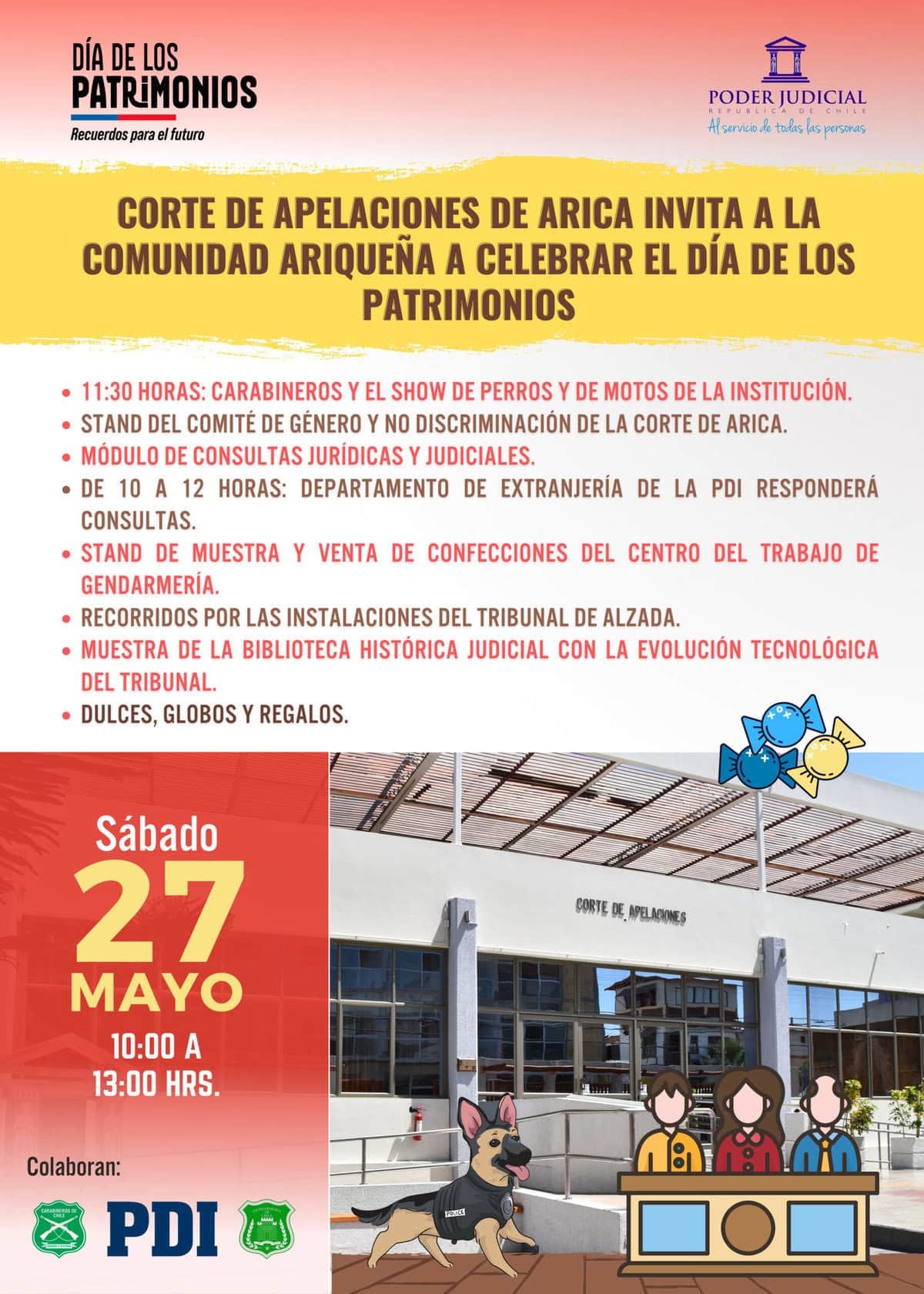 Mañana sábado 27 de mayo la Corte de Apelaciones de Arica abrirá nuevamente sus puertas para sumarse a las celebraciones del “Día de los Patrimonios”, luego de tres años de suspensión producto de la pandemia.