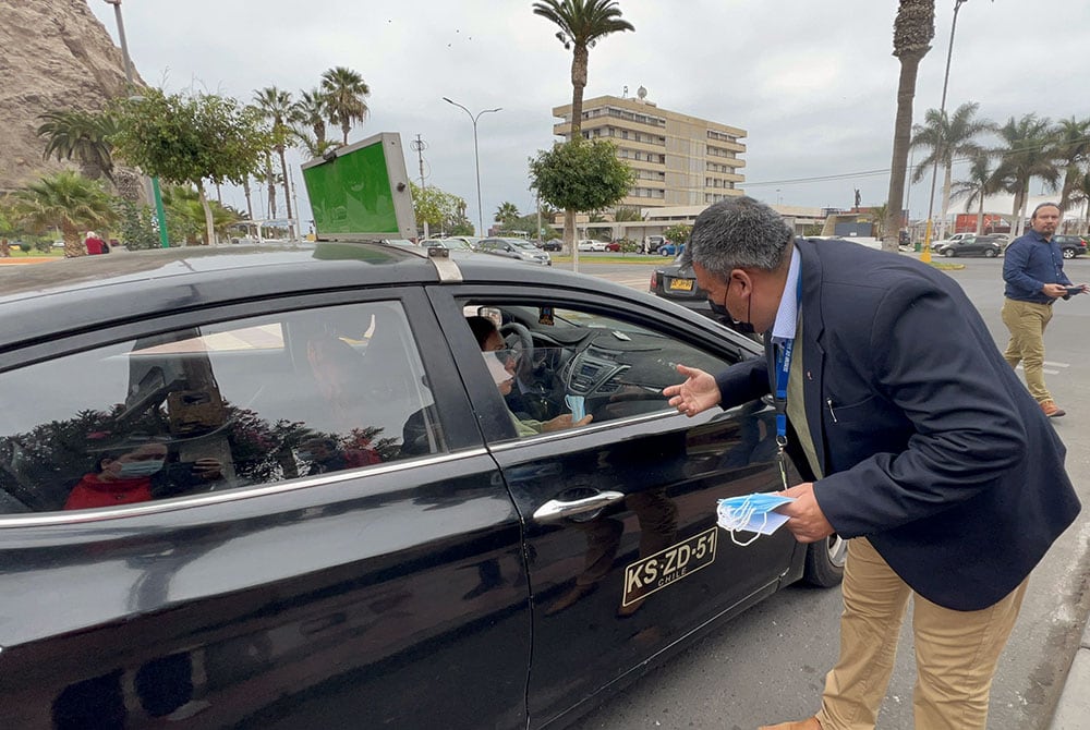 Tras el encuentro los Seremis Valenzuela y Maturana fueron hasta el paradero de colectivos de la calle San Marcos casi esquina con San Martín para entregar informativos y mascarillas a quienes esperaban tomar locomoción y también a conductores y conductoras que hacían su recorrido habitual.