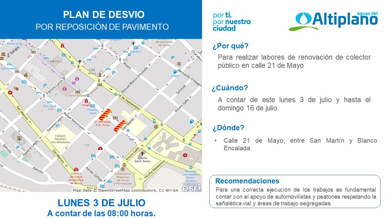 En el marco de su programa de mantención y mejoramiento de la red de colectores públicos y buscando brindar el mejor servicio a sus clientes, Aguas del Altiplano realizará la renovación de colector público en calle 21 de Mayo, entre las calles San Martín y Blanco Encalada.