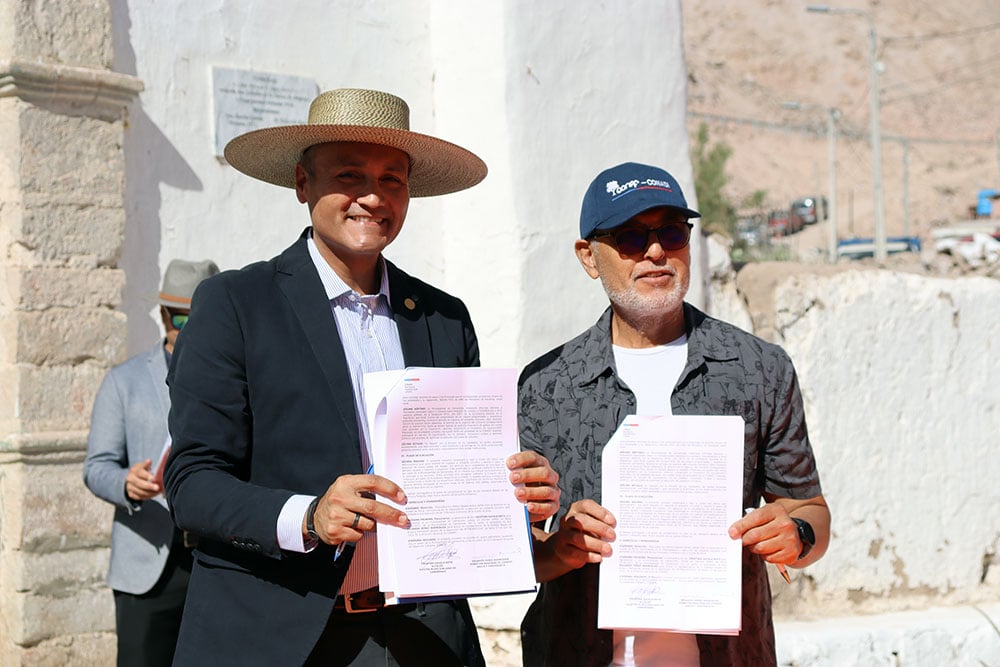 Eduardo Pérez Rodriguez, director regional de la Corporación Nacional de Desarrollo Indígena, CONADI y Cristian Zavala Soto, alcalde de la Ilustre municipalidad de Camarones y presidente de la asociación de municipios rurales de Tarapacá y Arica y Parinacota, firman convenio de colaboración para desarrollar proyectos de riego en la comuna de Camarones.