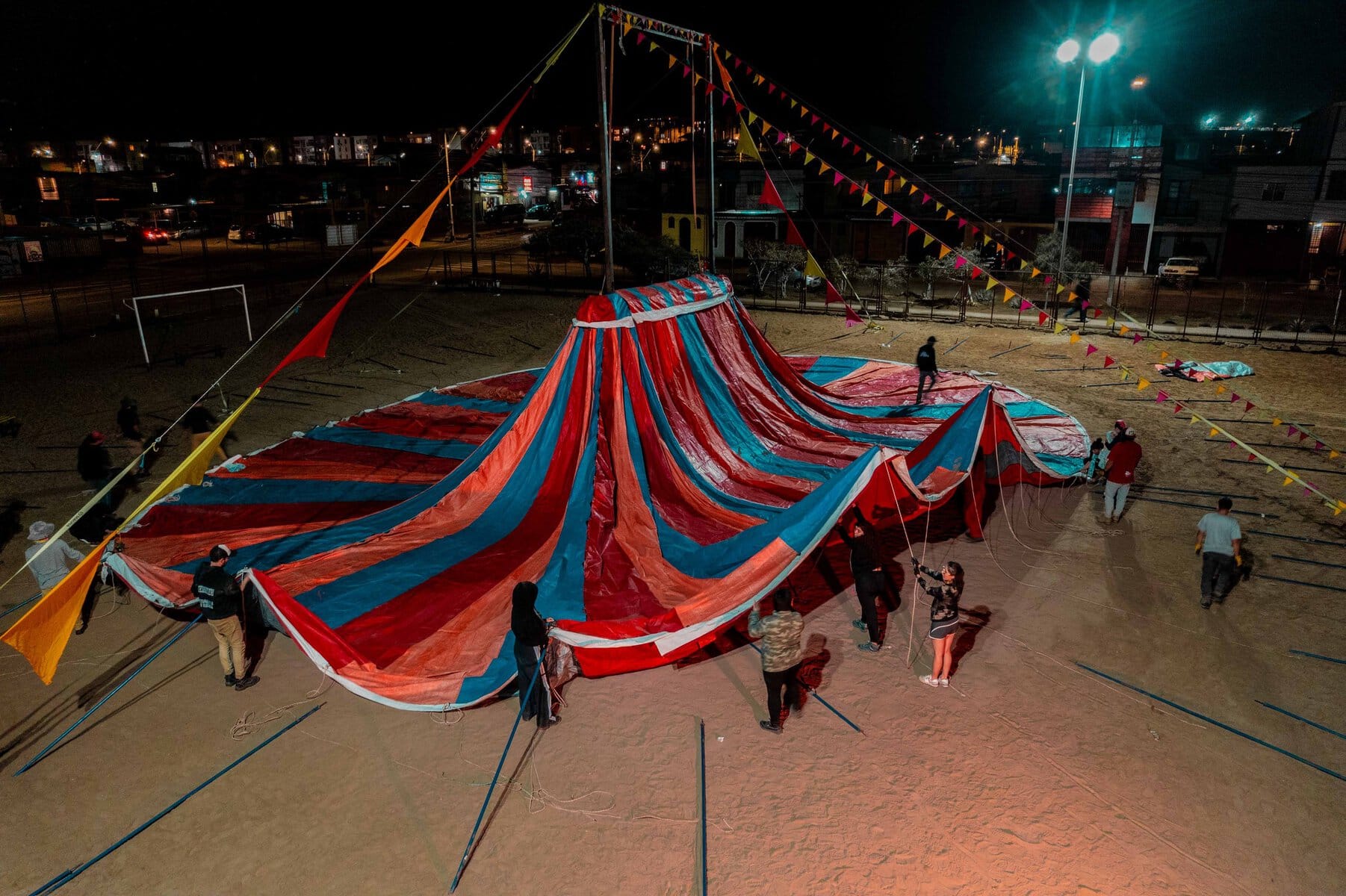 La jornada previa al sahumerio, alrededor de 20 voluntarios se reunieron bajo la dirección de la rigger Nicol Caracol, para levantar la carpa carnavalona por tercera vez en los 10 años de Carnavalón Teatral en la población Chinchorro Oriente 1.
