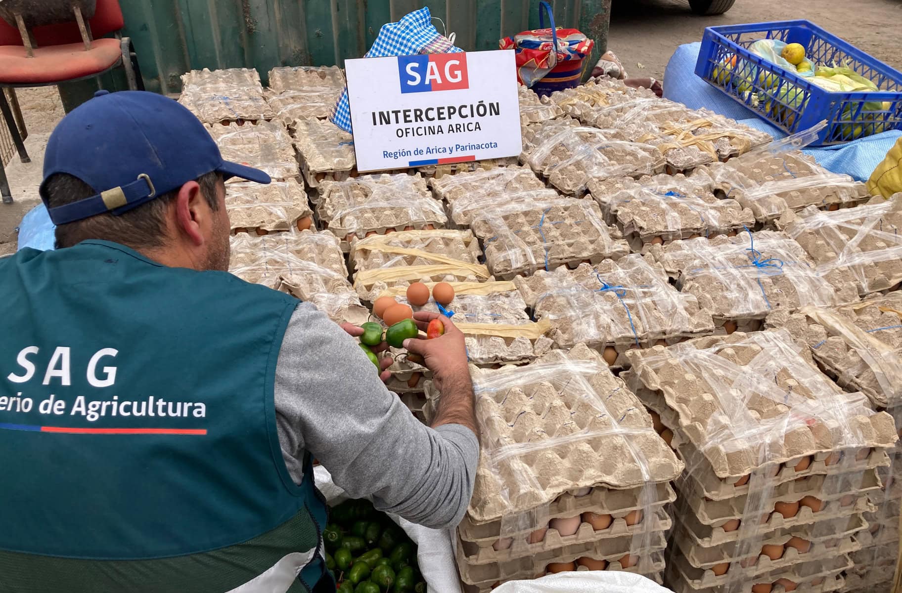 En la Ruta 11-CH, en la localidad de Poconchile, el Equipo de Vigilancia Post Frontera de la Oficina Arica del Servicio Agrícola y Ganadero interceptó 12 mil huevos que habían ingreso de manera clandestina por pasos no habilitados al país, productos considerados de alto riesgo sanitario.