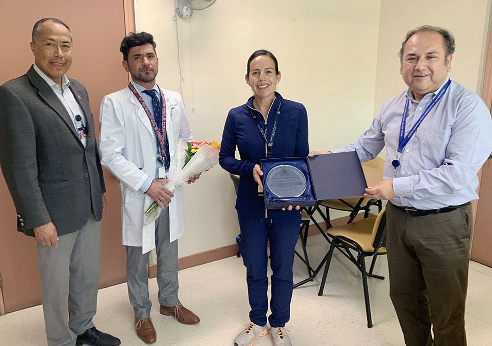 El director del Hospital Regional de Arica Dr. Juan Noé, Cristian Quispe, entregó un galvano de reconocimiento a la enfermera del policlínico de cardiología, Daniela Carrera, quien, en junio, en Colombia, se coronó como campeona panamericana de mountain bike categoría XCM o cross-country maratón.