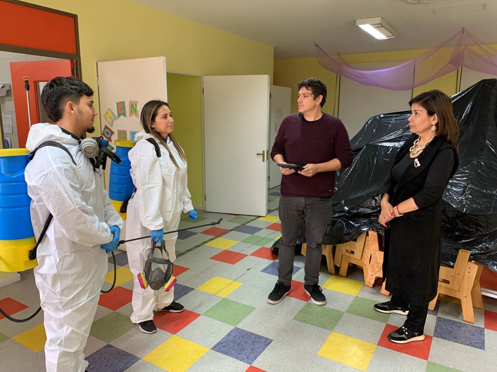 Sandra Flores Contreras, directora regional de esa institución, dio el vamos a los trabajos en compañía del prevencionista de Riesgos, Rodrigo Valderrama, explicando que esta semana y con la finalidad de resguardar la salud de niños, niñas y personal se inició la fumigación y sanitización de las salas y servicios higiénicos de los párvulos, oficinas, baños adultos y a los distintos espacios de todos los establecimientos.