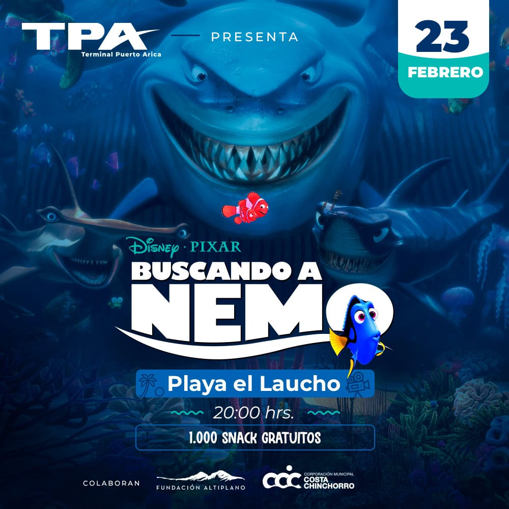 El próximo 23 de febrero, Terminal Puerto Arica (TPA) en colaboración con la Corporación Municipal Costa Chinchorro y la Fundación Altiplano, invitan a las familias de Arica a una tarde de cine en Playa El Laucho con la proyección de la película animada «Buscando a Nemo».