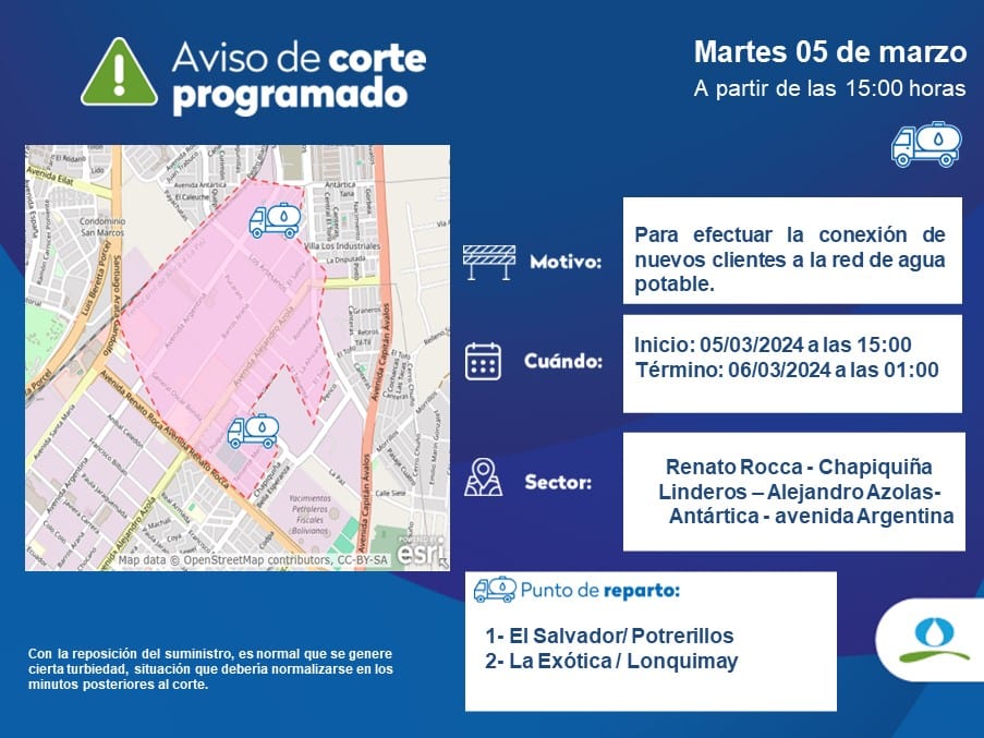 Según informó Roberto Ledezma Vega, Jefe (s) de la Unidad de Redes de Agua Potable de Aguas del Altiplano, la suspensión de suministro está programada a contar de las 15:00 horas de mañana martes 5 de marzo y se extenderá hasta las 01:00 de la jornada siguiente, abarcando el cuadrante conformado por avenida Renato Rocca, Chapiquiña, Linderos, avenida Alejandro Azolas, Antártica y avenida Argentina, con un total de 862 clientes asociados a esta suspensión programada.