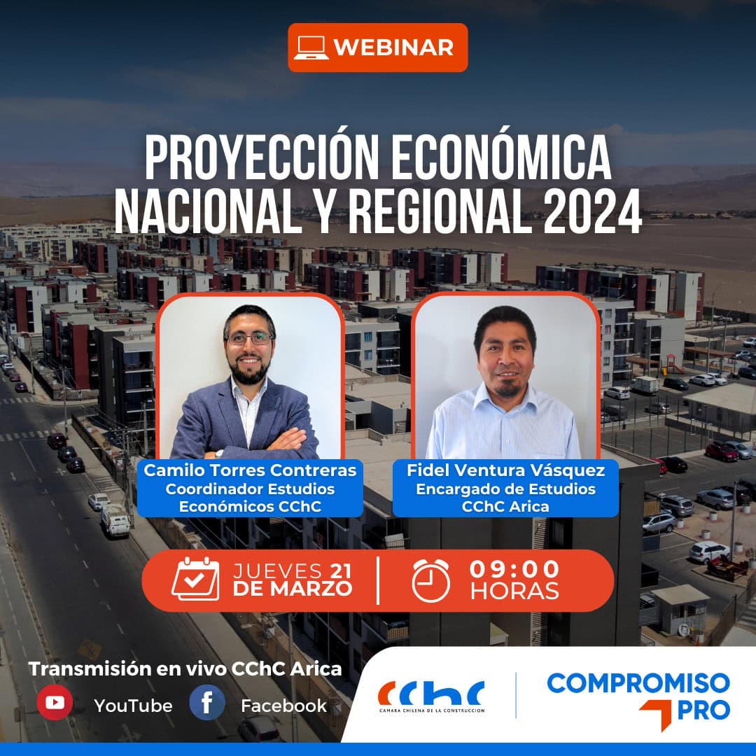 Para conocer el escenario económico del país y sobre todo de Arica y Parinacota, es que la sede regional de la Cámara Chilena de la Construcción (CChC) transmitirá este jueves 21 (9:00hrs) un webinar denominado como “Proyección Económica Nacional y Regional 2024”, el que es abierto para toda la comunidad.