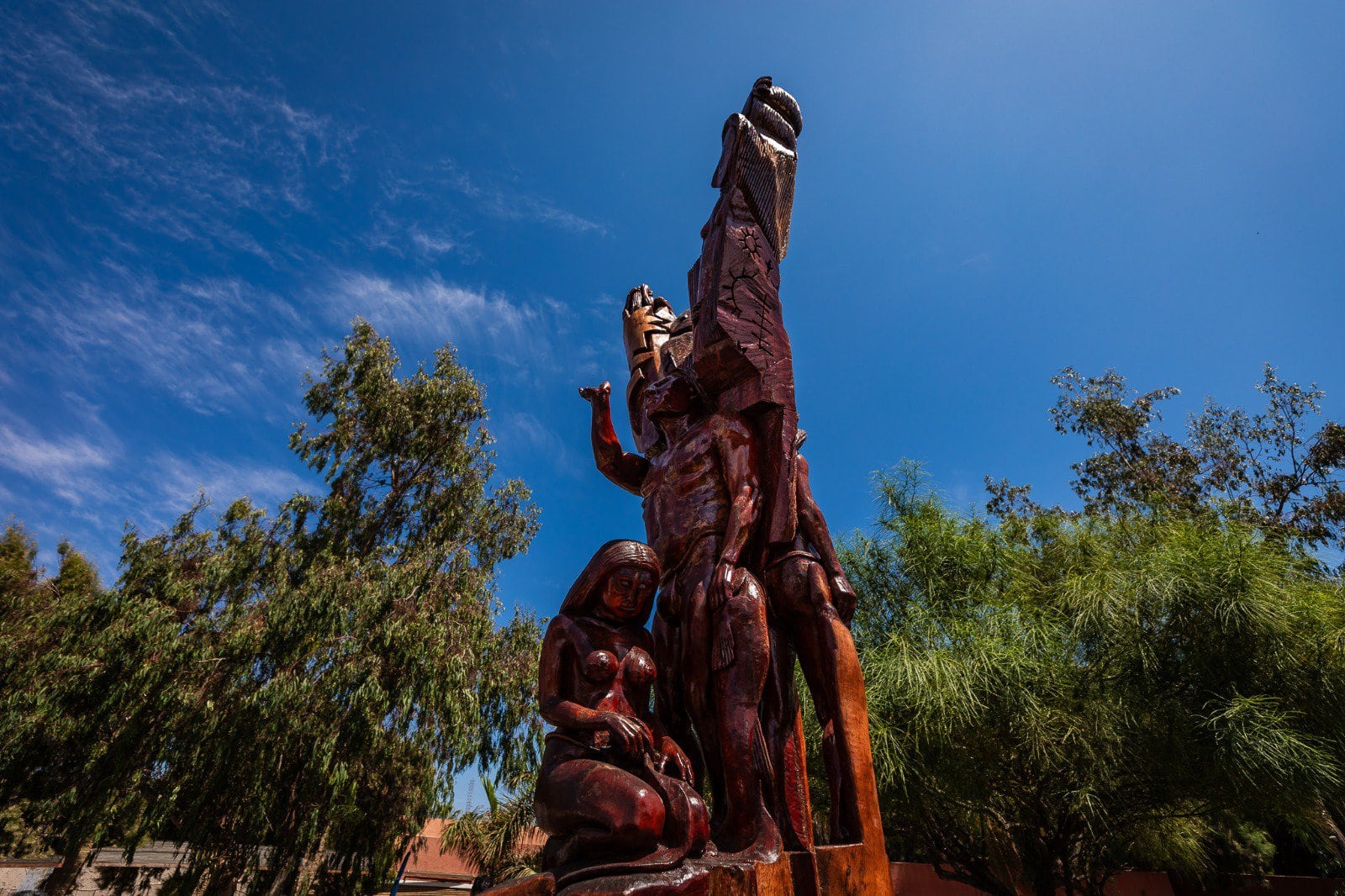 La obra, tallada magistralmente en el tronco de un árbol seco, rinde homenaje a la ancestral cultura Chinchorro que habitó la región hace milenios. Su ubicación estratégica en la entrada del parque, una vez un simple tronco, ahora transformado en una imponente representación artística, pretende ser un punto de encuentro entre la historia y la modernidad de la región.