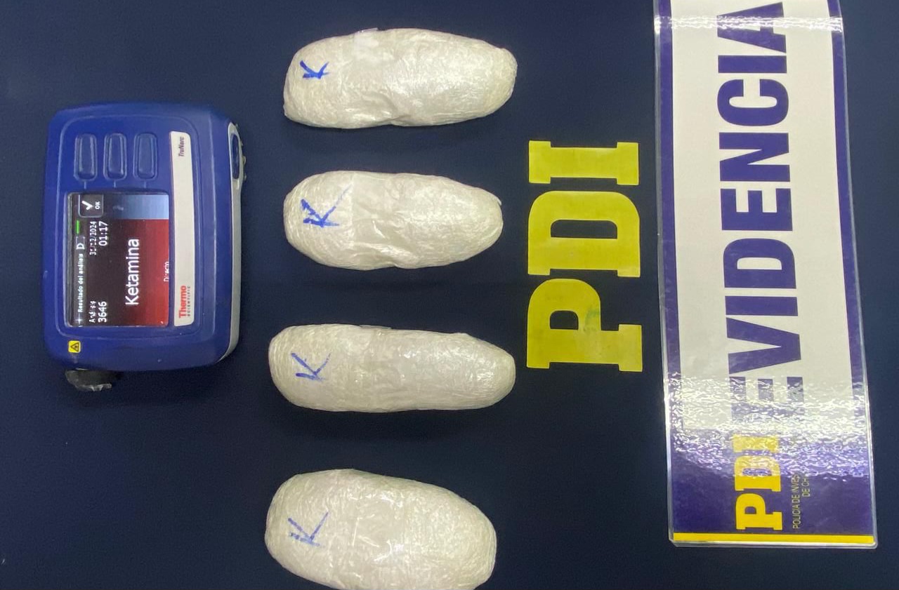 “En la revisión voluntaria de esta mujer, los oficiales hallaron adosados a su cuerpo cuatro contenedores que mantenían en su interior una sustancia en polvo, la que, sometida a la prueba de campo instrumental, arrojó positivo para ketamina”, comentó el subprefecto José Quiroz, jefe de la Avanchaca de la PDI Arica.