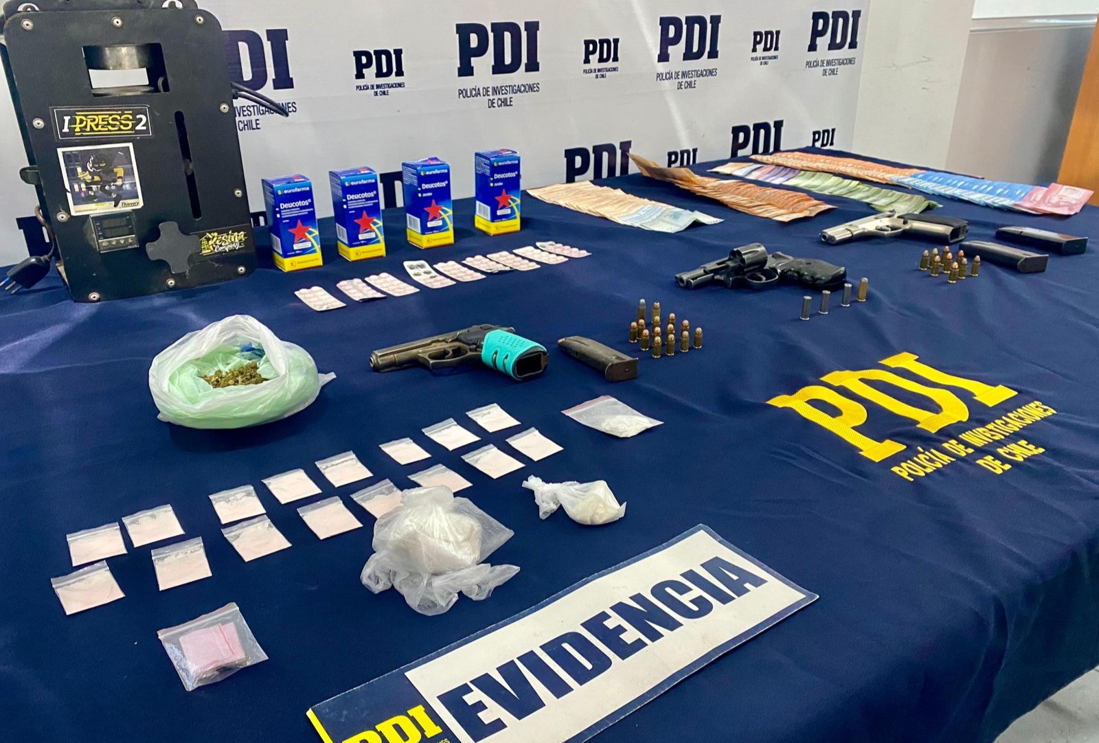 Se detuvo a 8 imputados, 4 hombres y 4 mujeres, todos de nacionalidad chilena, y se incautaron armas, municiones, dinero en efectivo, y diversas drogas como clorhidrato de cocaína, ketamina, y cannabis sativa, y medicamentos controlados como clonazepam y jarabes con codeína, listos para su comercialización.