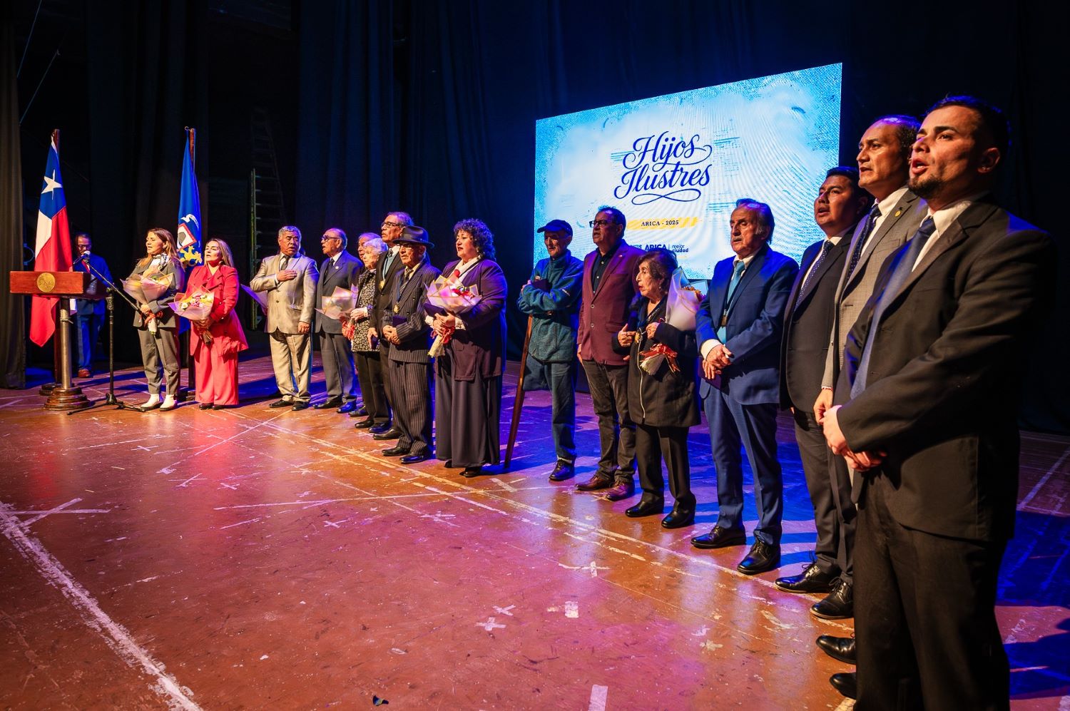 Bajo la ovación del público recibieron la medalla de Hijos Ilustres de Arica: el zapatero remendón del mercado Central Florentino Núñez, el futbolista ariqueño campeón en U. de Chile, Guillermo “chino” Olivares, la gestora cultural María Eugenia González Yanulaque, el entrenador de fuerzas básicas, Mario Gutiérrez, el periodista Nelson Torres, el presidente del club Gallo Salitre, Carlos “Chalo” Paredes, la educadora Jova Belzú, el fundador de Achachis Generación 90, Ponciano Lanís y a la presidenta del Sindicato de Orilleros, Buzos y Conexos de Pericos, Alexia Rivera.