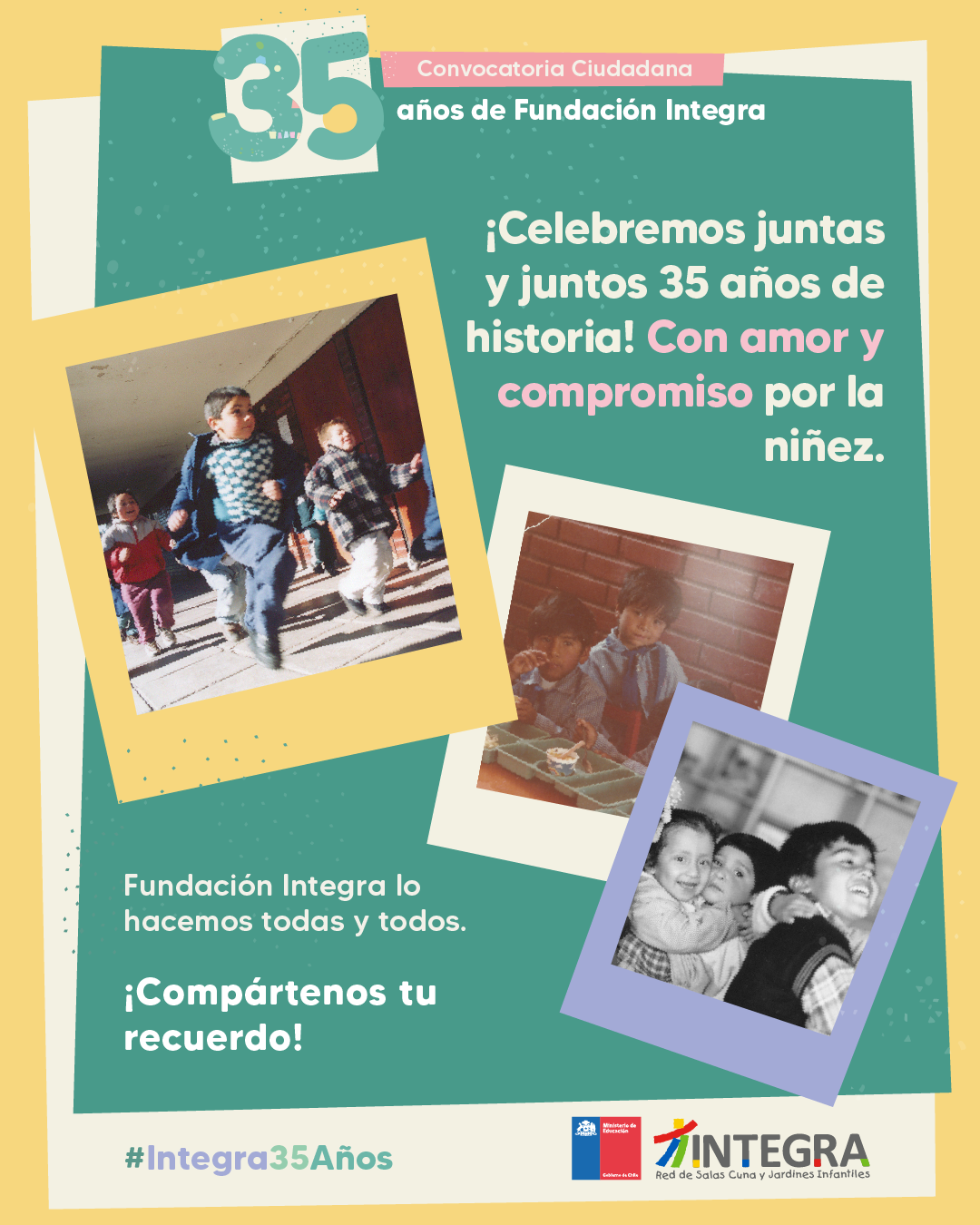 Es por ello que, como una manera de preservar ese legado y proyectarlo hacia los próximos 35 años, a partir del miércoles 23 de julio las familias podrán participar de una Convocatoria Ciudadana que buscará, a través de las imágenes que posean de su etapa en la Educación Parvularia Pública, plasmar la historia de Fundación Integra.