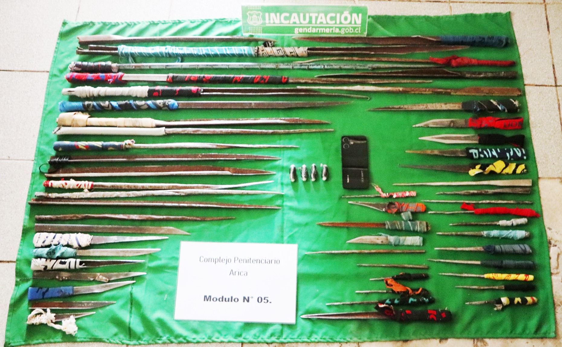 En tanto, en el módulo Nº 05 de condenados, se incautó 01 teléfono celular, 53 armas blancas de fabricación artesanal y 04 ovoides contenedores de una sustancia vegetal color verde.