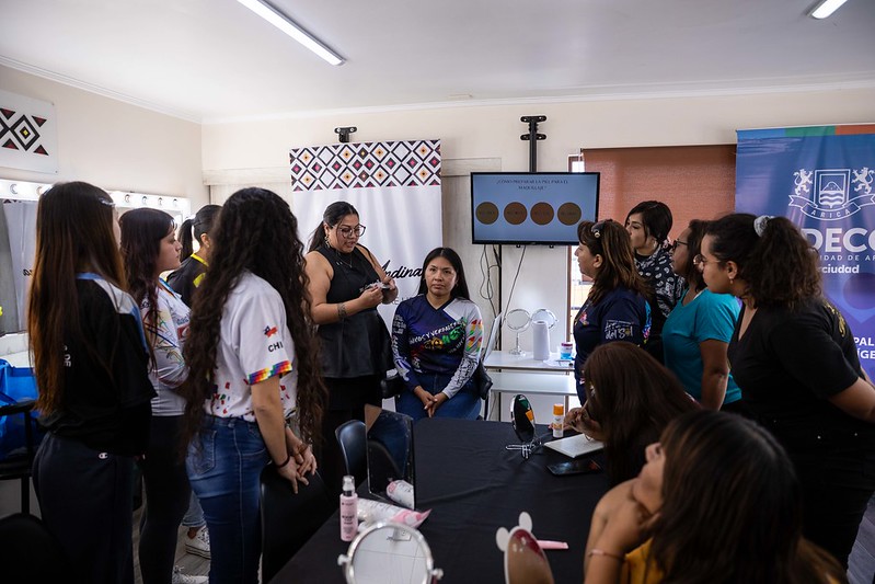 Maria Chambe, funcionaria de la Oficina de Desarrollo Indígena, explicó que el objetivo del taller es “dar herramientas a las bailarinas de diversas agrupaciones para que aprendan técnicas de automaquillaje, evitando costos adicionales y fortaleciendo la economía de sus familias”.