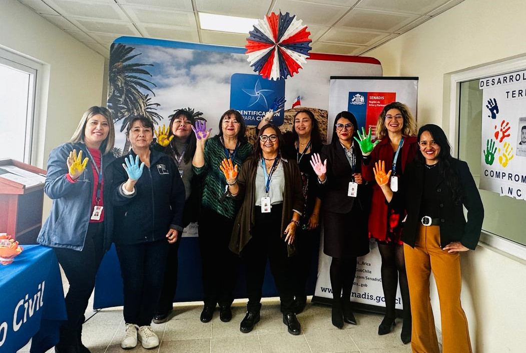 Las directoras de SENADIS y Registro Civil, junto a funcionarias, directivas y representantes de la municipalidad de Arica y de la Seremi de Desarrollo Social y Familia, simbolizaron el compromiso del trabajo por la inclusión, estampando sus manos con diversos colores en un cuadro preparado especialmente para la ocasión.