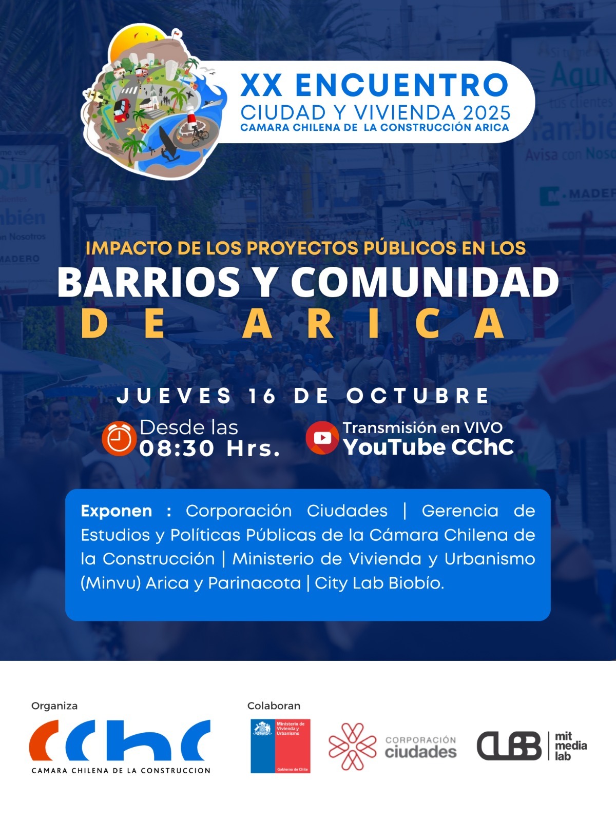 El XX Encuentro Ciudad y Vivienda ya tiene tema, fecha y hora. Este año se denomina como «Impacto de los proyectos públicos en los barrios y comunidad de Arica», la que se llevará a cabo el jueves 16 de octubre, desde las 8.30h, en transmisión por Youtube de la CChC nacional.