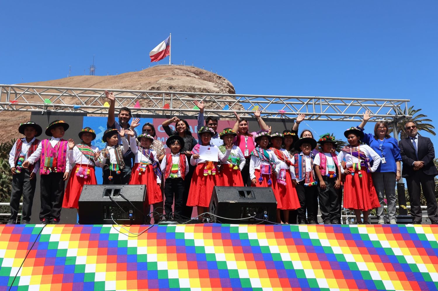 La plaza Vicuña Mackenna se vistió de colores, alegría, música, bailes y poesías donde más de 300 niñas, niños y adolescentes fueron las y los protagonistas en la “Fiesta de las Lenguas Indígenas 2025, Ayllu Arunakan Jach’a Phunchhäwipa 2025”, organizado por la Corporación Nacional de Desarrollo Indígena, CONADI, Arica y Parinacota.