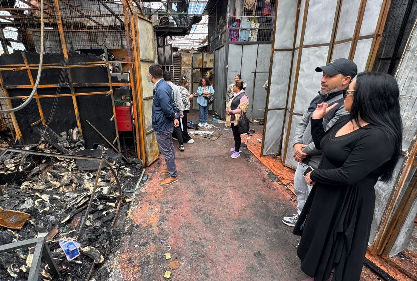 Autoridades regionales encabezaron un operativo en terreno para acompañar a los locatarios afectados y coordinar acciones de apoyo tras el incendio que, la noche del domingo, dejó 26 locales dañados.
