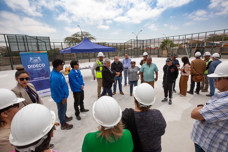 El alcalde de Arica junto a la directora regional del Servicio de Vivienda y Urbanismo (SERVIU), realizaron una visita a las obras de construcción de la nueva multicancha en la población Villa Araucanía, proyecto enmarcado en el Programa de Mejoramiento de Barrios (PMB) y que recibió el apoyo de la Oficina de Gestión Habitacional de la Municipalidad. La iniciativa busca potenciar los espacios públicos para el deporte, la recreación y la vida comunitaria.