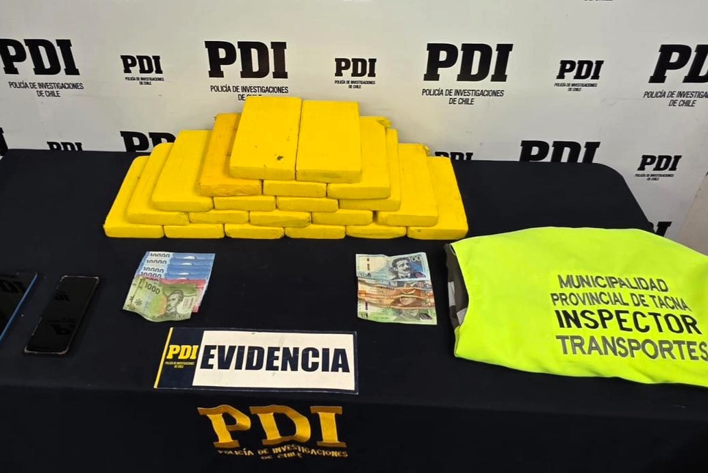 El trabajo investigativo de la Brigada Antinarcóticos y Contra el Crimen Organizado de la PDI Arica, junto a la Unidad de Análisis Criminal y Focos Investigativos de la Fiscalía de Arica, permitió detectar a los detenidos portando 20 paquetes de esta sustancia ilícita ocultos en el estanque de combustible del vehículo en el que se desplazaban. Uno de los detenidos es inspector de tránsito de la Municipalidad de Tacna.