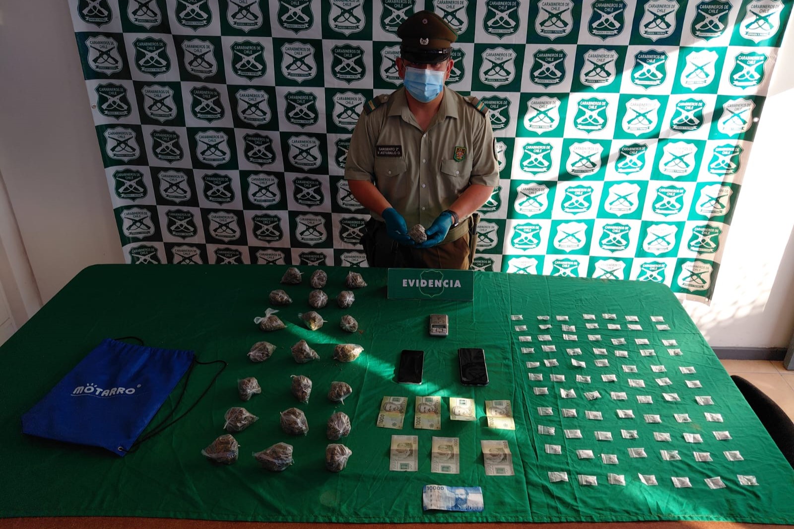 Al inspeccionar el móvil, los efectivos policiales hallaron en el piso del copiloto una bolsa de tela azul que contenía múltiples paquetes dosificados. Tras la intervención de la unidad especializada OS7, se confirmó la incautación de 443 gramos de Marihuana (distribuidos en 22 bolsas) y 49 gramos de Clorhidrato de Cocaína (dosificados en 77 envoltorios tipo ziploc).